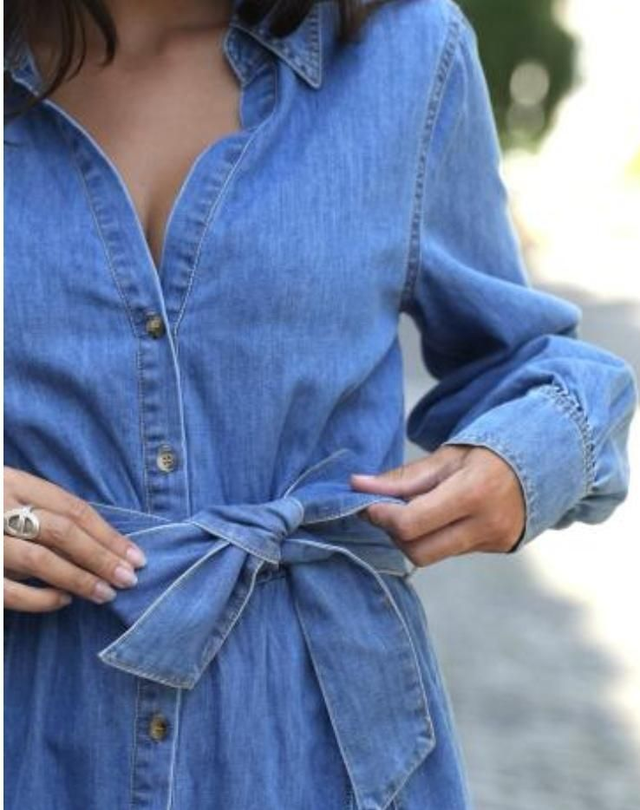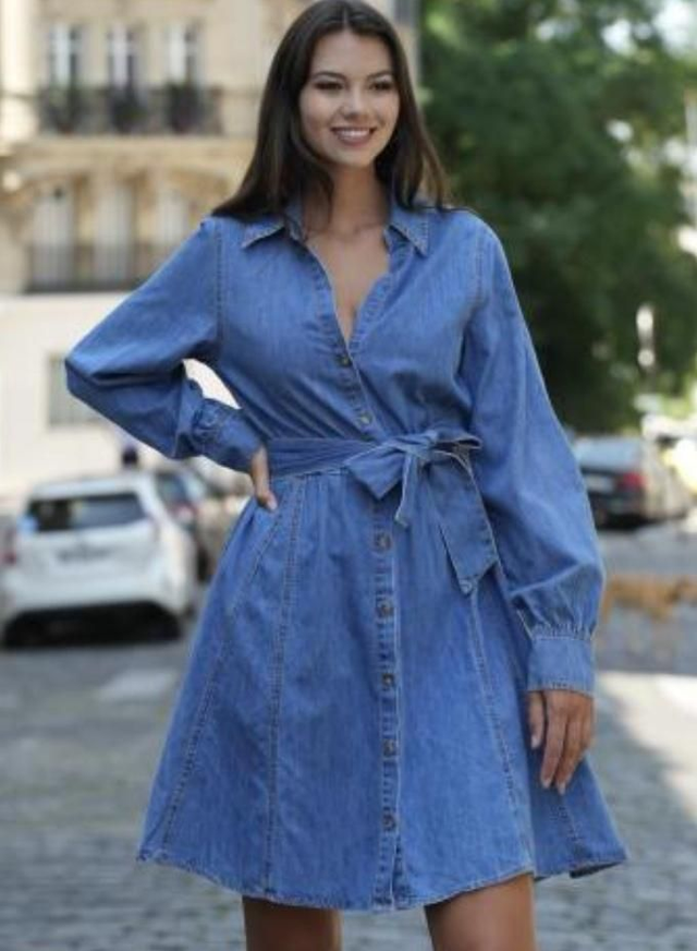 Robe en jeans courte, col chemise et v, bas de robe coupe évasée, ceinture ton sur ton, le mannequin mesure 175 cm, porte une taille S.